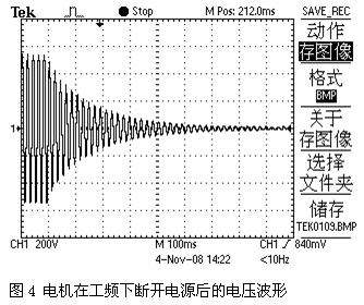 由于變頻器輸出的是PWM波,其相位不易觀察,測得在工頻狀態下的電壓波形進行進一步的分析。因為變頻器50Hz時的輸出電壓與工頻電壓作用在電機上基本時等效的,并不影響分析結果。圖4是一2.2KW電機在工頻電源下突然斷開電源后的電壓波形圖,由該圖可以看出,電壓波形沒有跳變,所以斷開瞬間感應電動勢與電源電壓是同相位的,其幅值也是基本相等的。隨著剩磁的慢慢消失,電壓幅值逐漸降低,同時伴隨著轉速的降低感應電動勢的頻率逐漸下降,其相位也逐漸與電源相位拉開。頻率越低,單位時間內拉開的相位差也就越大。