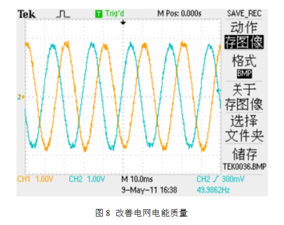 響應速度小于5ms,對于電網電壓的跌落和閃變具有一定抑制作用并網波形(如圖8所示):