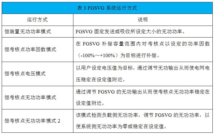 運行方式包含了五種:恒裝置無功功率模式、恒考核點無功功率模式、恒考核點功率因數模式、恒考核點電壓模式、恒考核點無功功率模式2。由下拉框選定,并于右側設定目標值,目標值可隨時更改,更改后可根據檢測值檢查補償效果。如表3所示,對“運行方式”進行了詳細說明。