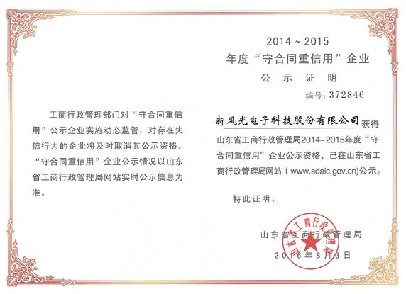 9月7日,新風光電子科技股份有限公司收到由山東省工商行政管理局下發的2014-2015年度山東省“守合同重信用”企業公示證明,山東省“守合同重信用”企業這一稱號是目前全省誠信經營方面的榮譽。新風光公司繼2012-2013年度獲得山東省“守合同重信用”企業后,再度獲得該項殊榮。