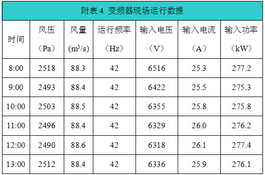 2011年5月16日,變頻器運行數據如附表4所示,測試功率因數為:0.976。
