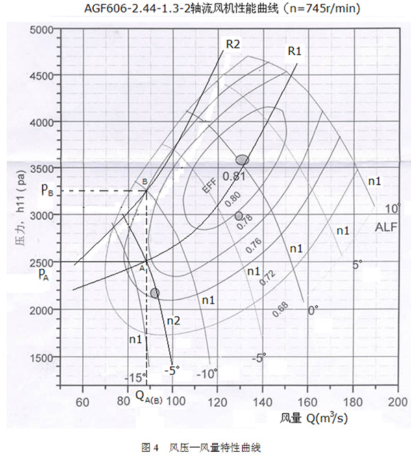 主通風機為軸流式排風機,風機兩臺,一用一備,每臺功率800kW,下圖4為AGF606-2.44-1.3-2特性曲線圖,R1為礦井的通風阻力曲線,R2為調整風門后的阻力曲線,由圖4可知,當需風量為QA時,動葉角度為-50時、風機效率小于72%,這時需將動葉角度調至-100(圖中的B點),以提高風機的運行效率,這時風機的運行效率約為74%,由礦井的通風阻力曲線R1和風機的性能曲線圖,可知風機在動葉角度為-50時,效率較高,這時可通過變頻器調節風機轉速調至A點,以滿足風量要求,這時風機運行在較佳狀態,此時變頻器的運行平均功率為:P變=276.3kW,變頻運行與風機工頻運行相比風壓損失功率為: