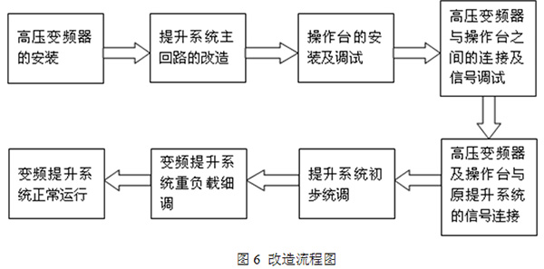 (3)接下來進行操作臺的固定安裝,連接操作臺與變頻器之間的連線,調試操作臺與變頻器的信號傳遞,正常后把變頻器和操作臺聯入到原操作系統中統調,帶重載調試這是改造中的重點部分。整個改造工程流程如圖6所示: