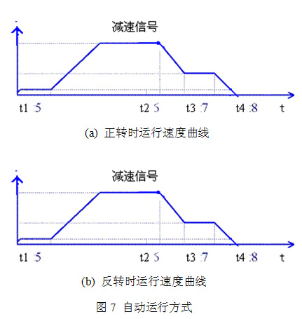 圖7中,以正轉為例,開機時低速爬行時間t1、收到減速信號后減速動作時間t2、中速運行時間t3、停機前爬行時間t4根據現場情況可以自由設置。提升機運行過程中,除開、停機外,可以不需要人工干預。
