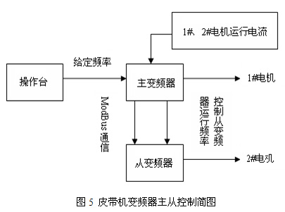 對于兩機驅(qū)動的皮帶機變頻控制,為了有效實現(xiàn)電機的負載平衡控制,高壓變頻調(diào)速系統(tǒng)適宜采用主-從方式進行控制。現(xiàn)場采用2臺450kW變頻器分別控制2臺400kW高壓電機,如圖5所示,選用1#變頻器為主變頻器,2#變頻器為從變頻器,由操作臺發(fā)給主變頻器給定頻率值,主從變頻器之間采用ModBus總線通信,1#變頻器作為主控,檢測1#和2#電機的運行電流,發(fā)出輸出轉(zhuǎn)矩給定值,控制2#從變頻調(diào)速系統(tǒng)同步運行。
