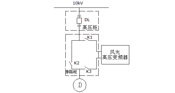 圖1旁路柜中,共有3個高壓隔離開關(guān),為了確保不向變頻器輸出端反送電,K2與K3采用電磁互鎖操動機(jī)構(gòu),實現(xiàn)電磁互鎖。當(dāng)K1、K3閉合,K2斷開時,電機(jī)變頻運(yùn)行;當(dāng)K1、K3斷開,K2閉合時,電機(jī)工頻運(yùn)行,此時變頻器從高壓中隔離出來,便于檢修、維護(hù)和調(diào)試。