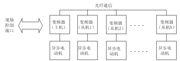 主機變頻器與各個從機變頻器之間通過光纖連接,一方面可采用高傳輸速率來提高響應速度,另一方面實現了電氣隔離有助于減小外部干擾。