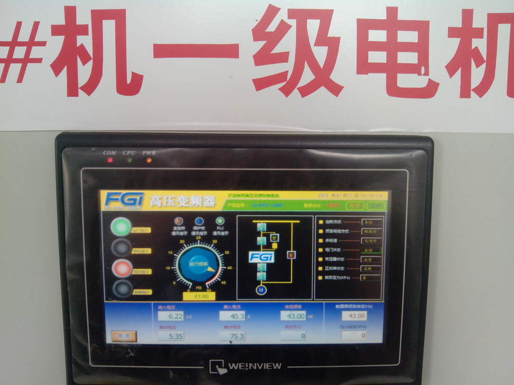 焦家寨煤礦通風(fēng)機(jī)選用JD-BP37-1000F風(fēng)光變頻器4套,于2013年7月2日變頻器一次性投運(yùn)成功,至今運(yùn)行正常。變頻運(yùn)行后,風(fēng)門全部打開,用戶根據(jù)所需風(fēng)量風(fēng)壓實(shí)時(shí)調(diào)節(jié)變頻器頻率,進(jìn)而調(diào)節(jié)通風(fēng)機(jī)運(yùn)行工況。不僅完全滿足煤礦生產(chǎn)工藝要求,而且用戶操作非常方便。現(xiàn)場(chǎng)調(diào)試中發(fā)現(xiàn),1#風(fēng)機(jī)的前后兩級(jí)電機(jī)采用高壓變頻器分別獨(dú)立控制,可以有效避免喘振現(xiàn)象?,F(xiàn)場(chǎng)測(cè)試1#風(fēng)機(jī)有關(guān)數(shù)據(jù)如下。一級(jí)電機(jī)運(yùn)行參數(shù),運(yùn)行頻率:43Hz,變頻輸入電流:40.3A,輸入電壓:6.22kV,輸出電壓:5.35kV,輸出電流:75.3A;二級(jí)電機(jī)運(yùn)行參數(shù),運(yùn)行頻率:39Hz,變頻輸入電流:45.3A,輸入電壓:6.31kV,輸出電壓:4.92kV,輸出電流:76.5A。人機(jī)界面現(xiàn)場(chǎng)照片如圖4所示。