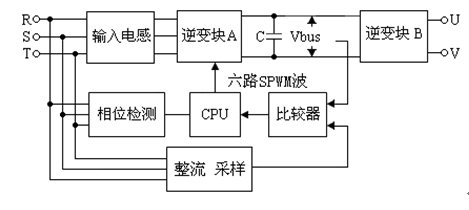 ②當電機進入發(fā)電狀態(tài),其再生能量經(jīng)逆變器的續(xù)流二極管向中間濾波電容充電,使中間直流電壓升高,此時在PWM控制下將能量回饋到交流電網(wǎng),完成能量的雙向流動。