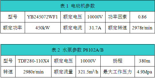 輻射進料泵(P8102AB)給焦化爐供應原料,輻射進料泵流程如圖1所示。輻射進料泵(P8102AB)拖動電機功率為450kW,額定電流為 31.7A,具體參數(shù)如表1、表2所示。