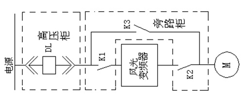 手動旁路中,共有3個高壓隔離開關K1、K2、K3,當K1、K2閉合,K3斷開時,10kV電源經(jīng)隔離刀閘K1到高壓變頻裝置,變頻裝置輸出經(jīng)K2送至電動機,電動機變頻運行;一旦變頻裝置出現(xiàn)故障,可斷開隔離刀閘K1、K2,合上K3,在工頻電源下啟動電機運行,此時變頻器從高壓中隔離出來,便于檢修、維護和調(diào)試。隔離刀閘K1、K2、K3之間具有閉鎖和防止誤操作功能。