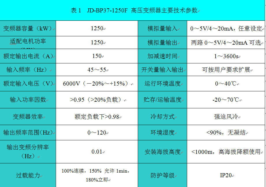 JD-BP37-1250F高壓變頻器技術參數如表1所示。