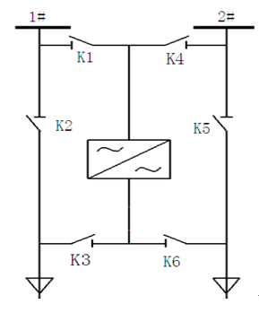該注水站結合該自身的實際情況,為滿足泵站的安全運行需求,要求柱塞水泵電機一用一備設置,選擇新風光高壓變頻調速系統采用一拖二手動運行方式(變頻器分別接1100kW水泵2臺)。其主回路圖如圖2所示,其中K1刀閘與K4刀閘互鎖,保證兩路高壓電源不會同時作用于變頻回路;K2刀閘與K3刀閘互鎖,保證工頻電源與變頻電源不會同時作用于電機M1;K5刀閘與K6刀閘互鎖,保證工頻電源與變頻電源不會同時作用于電機M2。