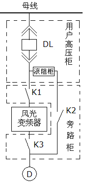 旁路柜中,共有3個高壓隔離開關,為了確保不向變頻器輸出端反送電,K2與K3采用電磁互鎖操動機構,實現電磁互鎖。當K1、K3閉合,K2斷開時,電機變頻運行;當K1、K3斷開,K2閉合時,利用液阻柜啟動電機工頻運行,此時變頻器從高壓中隔離出來,便于檢修、維護和調試。