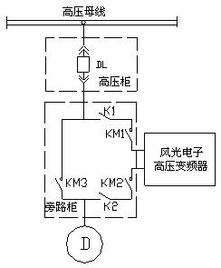旁路柜主要配置:三個真空接觸器(KM1、KM2、KM3)和兩個刀閘隔離開關K1、K2。KM2與KM3實現電氣互鎖,當KM1、KM2閉合,KM3斷開時,電機變頻運行;當KM1、KM2斷開,KM3閉合時,電機工頻運行。另外,KM1閉合時,K1操作手柄被鎖死,不能操作;KM2閉合時,K2操作手柄被鎖死,不能操作。