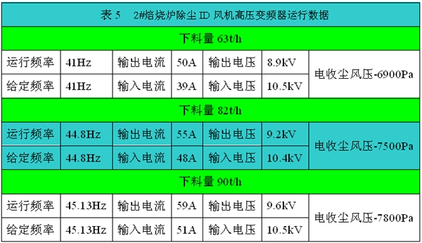 2011年6月廠節能服務中心隨機對2#焙燒爐不同下料量的情況下,對除塵ID風機高壓變頻器進行了測試,記錄數據如表5所示。
