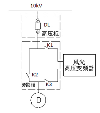 旁路柜主要配置:三個高壓斷路器(KM1、KM2、KM3)和兩個刀閘隔離開關K1、K2。KM2與KM3實現電氣互鎖,當KM1、KM2閉合,KM3斷開時,電機變頻運行;當KM1、KM2斷開,KM3閉合時,電機工頻運行。另外,KM1閉合時,K1操作手柄被鎖死,不能操作;KM2閉合時,K2操作手柄被鎖死,不能操作。