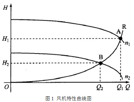風機特性如圖1所示。風機工作在A點時,其功率為PA=H1×Q1/102;風機工作在B點時,其功率為PB=H2×Q2/102。因Q2H1,故PA與為PB的值變化較大,說明采用變工頻工作方式時,改變風機的風量,風機的軸功率減小很大,節能效果顯著。