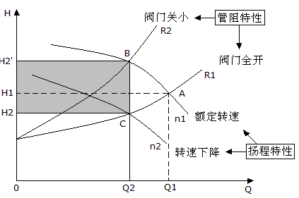 更直觀的水泵工作曲線圖見圖1:水泵的正常工作點為A,當水量需要從Q1調到Q2時,采用閥門調節,管網特性曲線由R1(閥門全開)改變為R2(閥門關小),其工作點調至B點,其功率為OQ2BH2’所圍成的面積,其功率變化很小,而其效率卻隨之降低。當采用變頻調速時,可以按需要升降電機轉速,改變設備的性能曲線,圖中從n1(額定轉速)到n2(轉速下降),其工作點調至C點,使其參數滿足工藝要求,其功率為OQ2CH2所圍成的面積,同時其效率曲線也隨之平移,依然工作在高效區。圖中陰影部分為實際節約能耗。