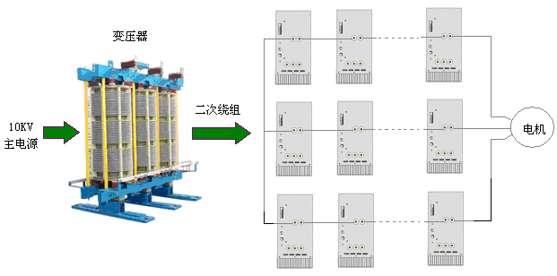 采用直接高壓變頻電路結構,功率單元多重化連接,直接輸出到高壓電機,提供驅動電壓。從物理結構上分為控制柜,功率柜,變壓器柜三大部分,根據現場工藝要求還可選配旁路柜、上位機、遠控盒,產品外形如圖2所示。