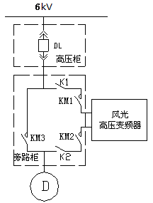 旁路柜主要配置:三個真空接觸器(KM1、KM2、KM3)和兩個刀閘隔離開關K1、K2。KM2與KM3實現電氣互鎖,當KM1、KM2閉合,KM3斷開時,電機變頻運行;當KM1、KM2斷開,KM3閉合時,電機工頻運行。另外,KM1閉合時,K1操作手柄被鎖死,不能操作;KM2閉合時,K2操作手柄被鎖死,不能操作。