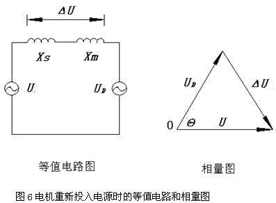 從圖4和圖5中可以看出,瞬間斷開電源后,電機感應電壓有所衰減,同時感應電壓與工頻電源電壓的相位已開始拉開,不同時刻投入工頻電源,將會產生不同的△U。圖6是電機重新投入電源時的等值電路和相量圖。