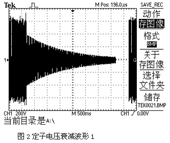由于變頻器輸出的是PWM波,其相位不易觀察,測得在工頻狀態下的電壓波形進行進一步的分析。因為變頻器50Hz時的輸出電壓與工頻電壓作用在電機上基本時等效的,并不影響分析結果。圖4是一2.2KW電機在工頻電源下突然斷開電源后的電壓波形圖,由該圖可以看出,電壓波形沒有跳變,所以斷開瞬間感應電動勢與電源電壓是同相位的,其幅值也是基本相等的。隨著剩磁的慢慢消失,電壓幅值逐漸降低,同時伴隨著轉速的降低感應電動勢的頻率逐漸下降,其相位也逐漸與電源相位拉開。頻率越低,單位時間內拉開的相位差也就越大。