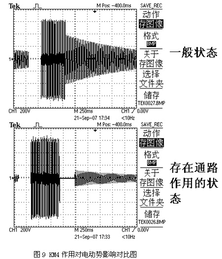 KM4作用對電動勢影響對比圖。由圖9可以看出,KM4提供通路的作用時間約為300ms,作用后該時刻與一般狀態同一時刻的感應電動勢幅值相比幅值小了很多。適當控制KM4的作用時間,讓其幅值減小到額定電壓的三分之一以下就可以了。這樣,即使切換至工頻電源時刻感應電動勢與工頻電源的相位相差180°,△U也不會超出其許可的安全范圍了。在KM4的作用過程中,會加快電機的轉速下降,但通過試驗得知,KM4的作用對電機轉速的影響比對感應電動勢幅值的影響要顯得多。
