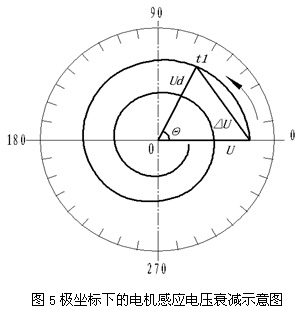 據此,繪出斷電后電機感應電壓Ud在極坐標下衰減的向量示意圖,如圖5中Ud所示。