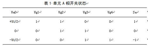 以A相為例:Ug1和Ug2導通時,A相輸出+U0/2;Ug2和Ug3導通時,A相輸出零電平;Ug3和Ug4導通時,A相輸出-U0/2。如果用Sa、Sb、Sc分別表示各橋臂的開關狀態,每一橋臂都有三種開關狀態,如表1所列。